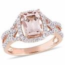 This beautiful cocktail ring features a cushion-cut morganite center stone enhanced by 58 round white diamond side stones. This attractive ring is crafted of gleaming 10-karat rose gold with a high polish finish.