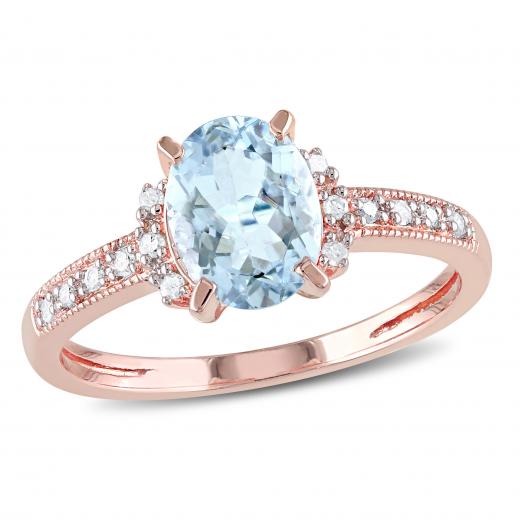 This charming cocktail ring features an oval-cut aquamarine center stone and round white diamond side stones. This exquisite ring is crafted of fine rose plated silver with a textured finish.