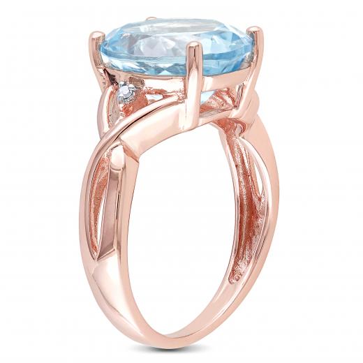 This elegant 3-stone ring features an oval-cut sky blue topaz center stone with two accenting white diamonds. This pretty engagement ring is set in rose plated silver with a high polish finish.