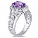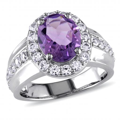 This stunning cocktail ring features an oval-cut amethyst center stone surrounded by a halo of round-cut created white sapphires. This beautiful ring is crafted of fine sterling silver enhanced with a high polish finish.