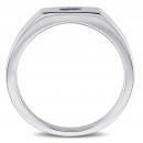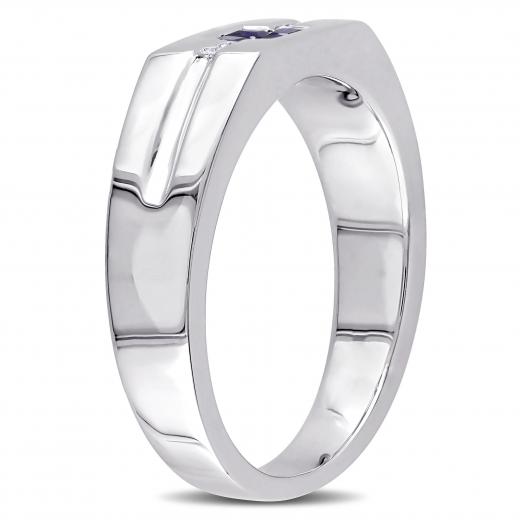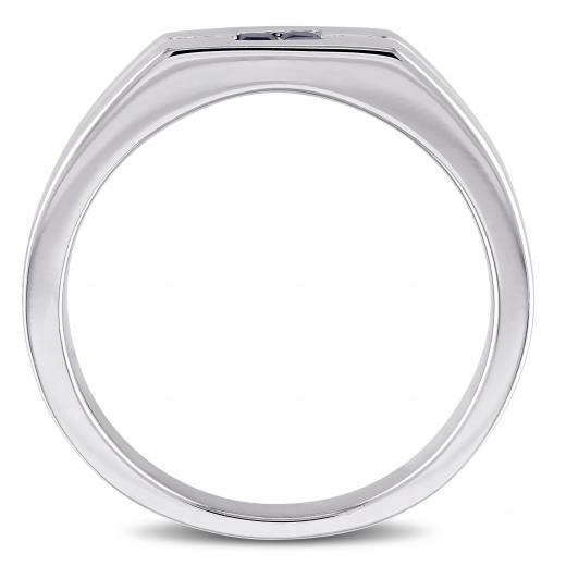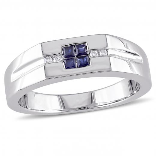 This stylish men's ring features square-cut sapphire center stones and white diamond side stones set in sterling silver. This ring glimmers with a high polish finished.