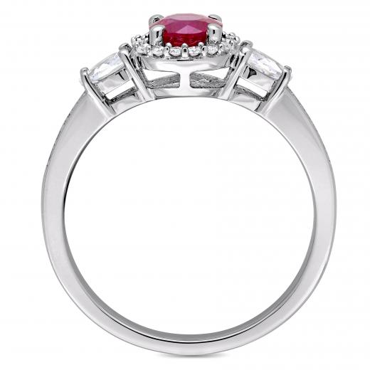 This stunning three-stone engagement ring is crafted in 14-karat white gold and features a round-cut ruby with two pear-cut white sapphires and 26 round-cut, prong and pave-set diamond along the band. This modern and sophisticated design is a perfect choice for a woman with an elegant and sophisticated style with a modern flare. Choose this style for your bride-to-be as you celebrate this special milestone in your lives together.