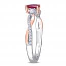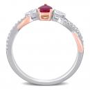 This delicate and sophisticated ruby and diamond heart engagement ring is crafted in lustrous 14-karat white gold with a rose gold accent and features a heart-cut, prong set ruby at its center paired with two pear-cut and 24 round-cut diamonds in a unique three-stone infinity design. Whether worn as an engagement ring or simply a gorgeous gemstone and diamond piece, this ring is sure to make a standout addition to any jewellery collection. Choose this piece either for yourself or someone you love.