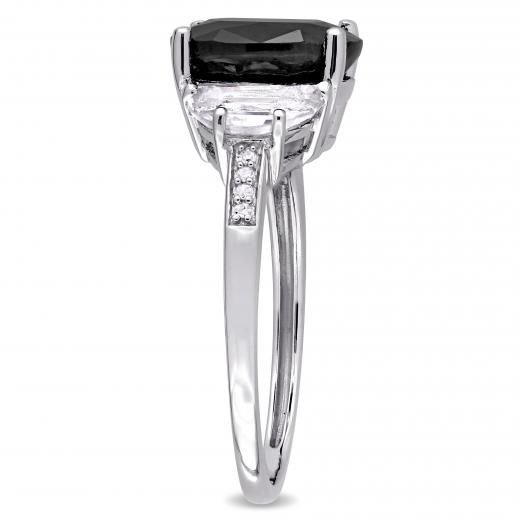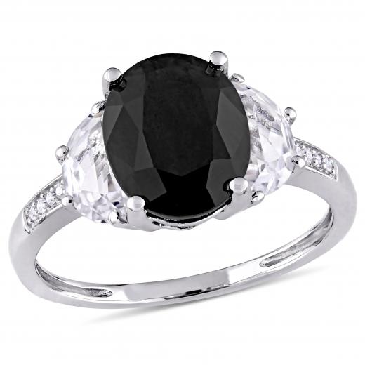 This flattering engagement ring is crafted in sterling silver and features a stunning black sapphire between two moon shape white sapphires and eight diamonds along its shank. It is perfect for all dressy occasions and even as an everyday statement piece.