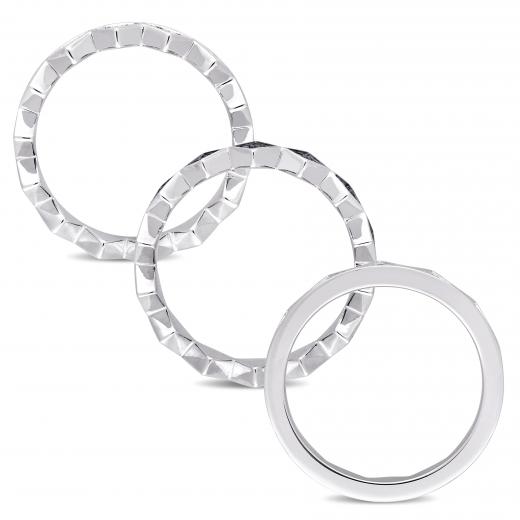This geometric stackable ring set is crafted in sterling silver with black rhodium and features dazzling created blue and white sapphires set in a unique geometric design. Whether worn together or apart, this modern ring set is sure to make a versatile addition to any jewelry collection.
