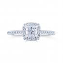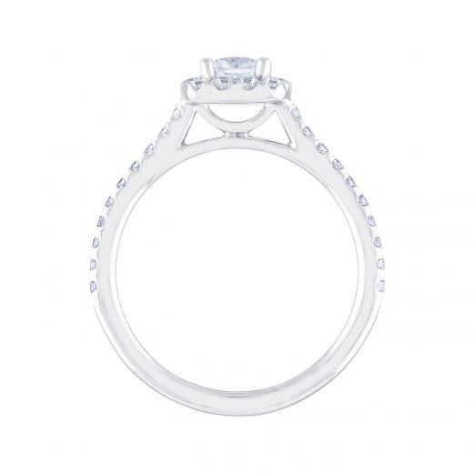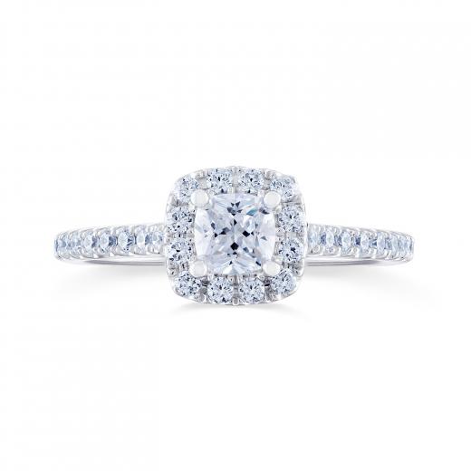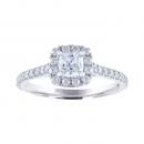 This timeless 14k white gold Diamond Revelations bridal ring is elevated with a .50ct cushion cut diamond at its centre, hugged in a divine halo. Additional round diamonds along the band add glamour to this stunning bridal ring.