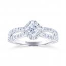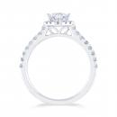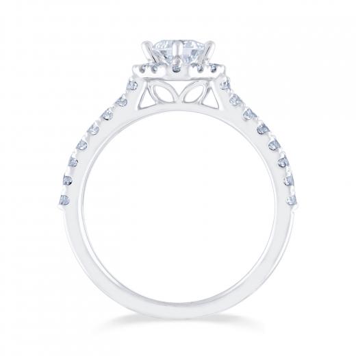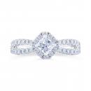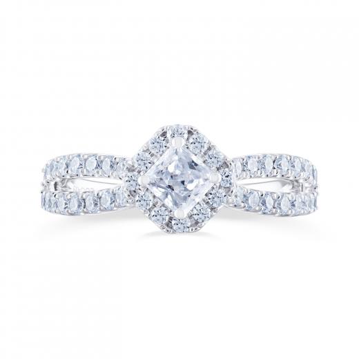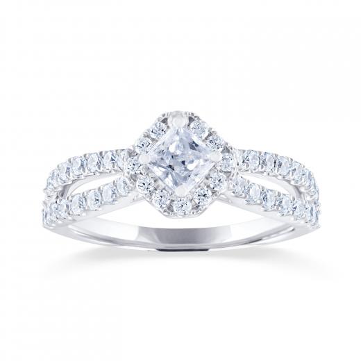 This exceptional Diamond Revelations bridal ring in 14k white gold sparkles endlessly. Crafted with an angled .40ct princess cut centre diamond and halo, this .95ctw bridal ring is perfectly accented with a split diamond band.