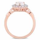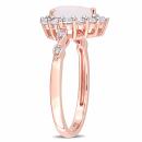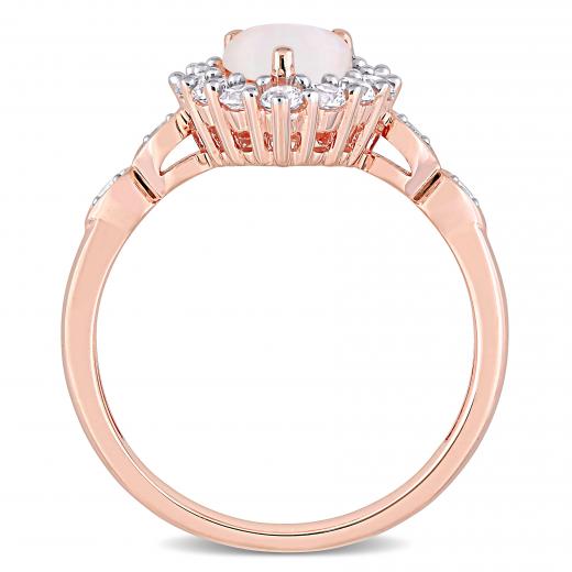 This shimmering opal, created white sapphire and diamond teardrop halo engagement ring is crafted in rose gold and features a pear-cut, prong-set opal gemstone at the center with a halo of 13 round-cut, prong-set created white sapphire gemstones and four round-cut, pave-set diamond-accents in a gorgeous gemstone bridal design. A modern take on a classic bridal style, this gemstone and diamond ring is a perfect choice for the woman you love as you celebrate this special milestone and begin the next chapter of your lives together.