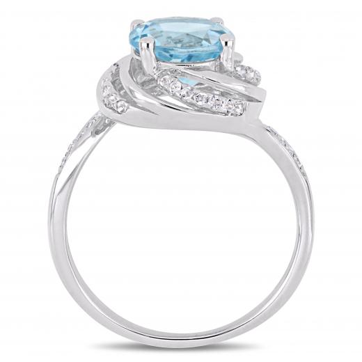 This unique sky-blue topaz, white topaz and diamond halo ring is crafted in lustrous sterling silver and features a round-cut, prong-set sky-blue topaz at the center with 28 round-cut, buttercup-set white topaz and eight round-cut, prong-set diamond accents set together in a modern swirl halo design. This ring is perfect for a woman who seeks simplicity and elegance in her everyday look. This piece is sure to make a valuable and valuable addition to any jewelry collection. A lovely piece for that special November birthday in your life.