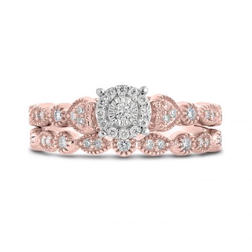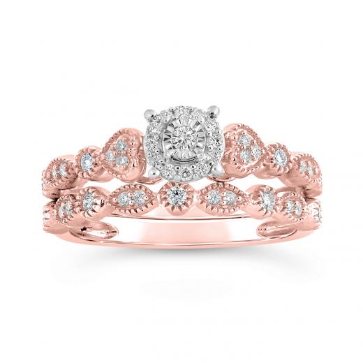 Proclaim your love with a beautiful bridal set designed in adoring 10k rose gold. This .25ctw bridal set features a round centre diamond set into an illusion setting. A halo of round diamonds adds additional sparkle to the centre while feminine diamond details along the band add a touch of charm. The perfectly matching wedding band accompanies the antique inspired engagement ring to complete this romantic bridal set.