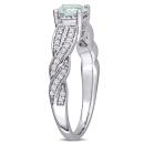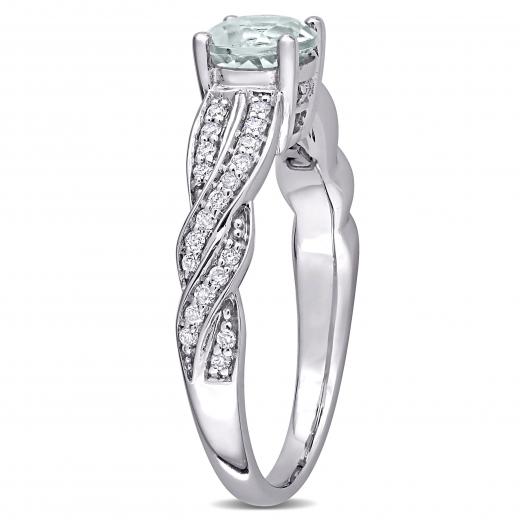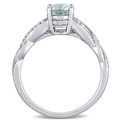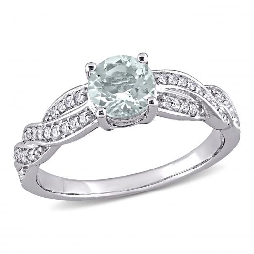 Treat yourself or someone you love to this stunning Aquamarine and Diamond Crossover Engagement Ring. Crafted in sparkling white gold, this trendy ring features a round-cut, prong-set aquamarine gemstone (6 x 6mm) at the center embellished by 46 round-cut, pave-set twinkling diamonds (G-H, I2-I3) resting along the band in a twisted crossover pattern. Enhanced with a high polish finish, this striking gemstone and diamond engagement ring is sure to add elegance to your special occasion and make it memorable.