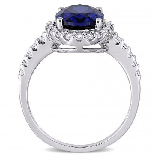 Radiate your feminine glow with this elegant Created White and Blue Sapphire Halo Ring. Mounted in lustrous white gold, it features an oval-cut, prong-set created blue sapphire gemstone (10 x 8mm) at the center with 30 round-cut, buttercup-set created white sapphire gemstones forming a halo and resting along band. Enhanced with a high polish finish, this gemstone halo ring makes the perfect addition to any jewelry collection.