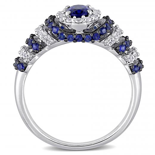 Give yourself a glamorous look when you wear this enchanting Created Blue Sapphire and Created White Sapphire Ripple Ring. Crafted in lustrous sterling silver, it features a gleaming oval-cut, prong-set created blue sapphire gemstone (6 X 4mm) in the center with a halo of round-cut, prong-set shimmering created white sapphire gemstones. It also showcases 36 dazzling round-cut, prong-set created white sapphires and 40 round-cut, prong-set created blue sapphire gemstones forming alternating rows down the band. Enhanced with a high polish finish, this charming gemstone ring makes a fashionable addition to any jewelry collection.