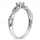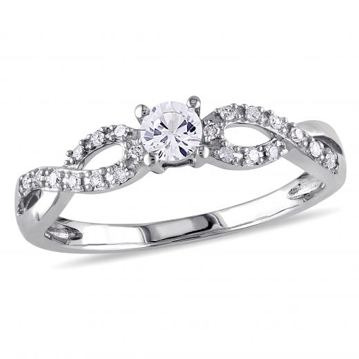 This gorgeous double infinity ring features a round-cut created white sapphire center stone and 20 round white diamond side stones. This stylish ring is crafted of gleaming 10-karat white gold with a high polish finish.
