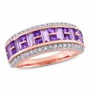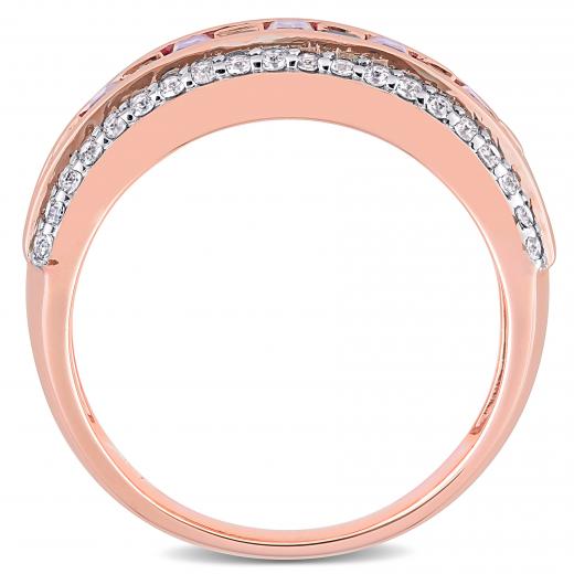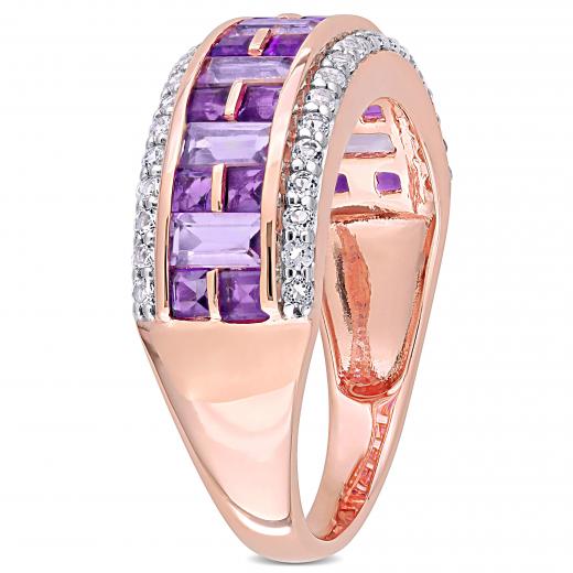 Tell her how much you love her with this dainty African Amethyst, Rose de France, and White Topaz Ring. Crafted in radiant rose gold, it features seven baguette-cut, channel-set lustrous African-amethyst gemstones (4 x 2mm) alternating with 16 princess-cut, channel-set rose de France gemstones. This ring is further beautified by 40 round-cut, pave-set white topaz gemstones adding sparkle. Enhanced with a high-polish finish, this gemstone anniversary ring is a perfect addition to any jewellery collection and a memorable gift for yourself or someone you love.