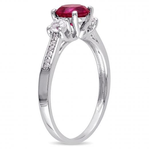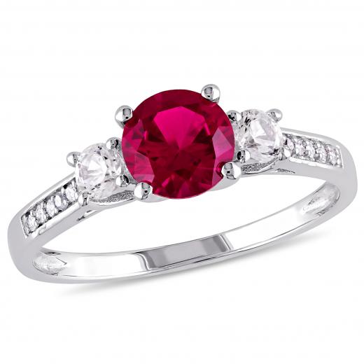 This shimmering three-stone ring features a round-cut created ruby center stone and created white sapphire with white diamond side stones. The ring is crafted of 10k white gold with a high polish finish.