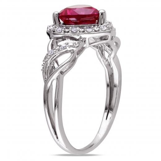 This lovely ring features a heart-cut created ruby center stone and round white diamond side stones. This beautiful ring is crafted of fine sterling silver with a high polish finish.