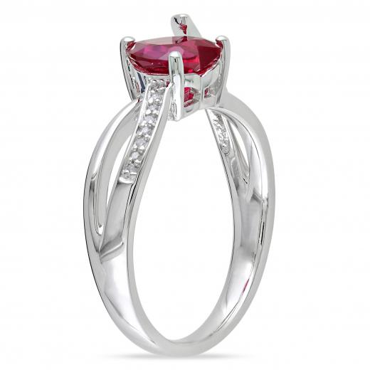 This attractive ring features a heart-cut created ruby center stone with round white diamond side stones set in sterling silver. This ring glimmers with a high polish finished.