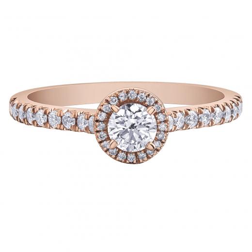 This elegant bridal ring is a true Canadian gem. Crafted in 10k rose gold, this romantic token of your love sparkles with a stunning .23ct brilliant round Glacier Fire Canadian diamond at its centre. Elevated with a halo of delicate round diamonds, this ring sparkles with additional diamonds along the pretty pink band.