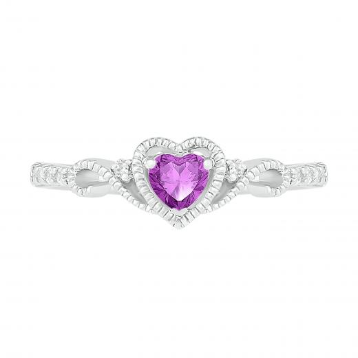 This delicate and romantic ring is crafted in lustrous 10K white gold and features a genuine heart shaped amethyst and shimmering diamonds. Bursting with vibrancy and elegance, this gemstone rings is sure to be a standout addition to any jewellery collection.