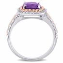This radiant multi-row halo engagement ring is crafted in two-tone white and rose plated sterling silver. This charming wedding ring features a cushion-cut amethyst centre stone surrounded by a halo of round white diamonds and additional diamonds beautifully embellished on the multi-row band. Pair this alluring rope design gemstone and diamond ring with any casual or business attire and look gorgeous. Enhanced with a high polish finish, this cocktail ring is a beautiful addition to any jewellery collection.