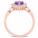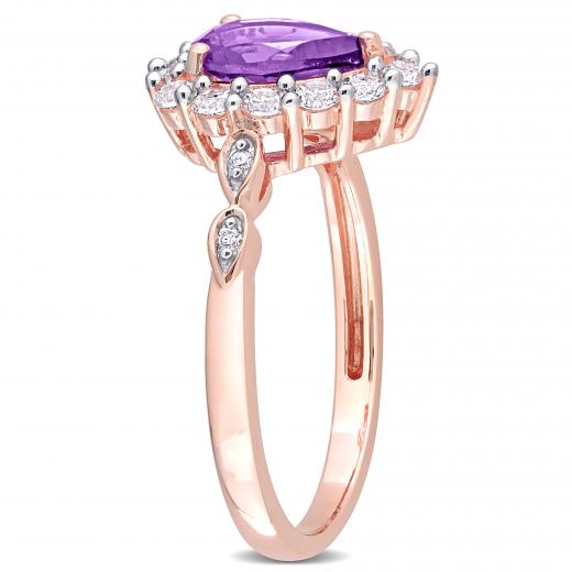 This shimmering teardrop halo engagement ring is crafted in 10-karat rose gold. This stunning wedding ring features a pear-cut amethyst at the centre with a halo of 13 round-cut created white sapphires and four round-cut diamond accents in a gorgeous gemstone bridal design. A modern take on a classic bridal style, this gemstone and diamond ring is a perfect choice for the woman you love as you celebrate this special milestone and begin the next chapter of your lives together. This lovely cocktail ring is a stunning addition to any jewellery collection.
