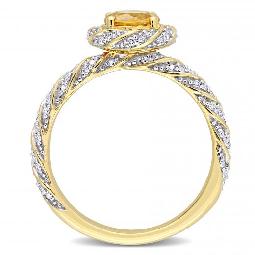 This dainty swirl halo ring is crafted in 14 karat yellow gold. This stunning wedding ring features a round-cut, prong-set citrine at the center of its 68 round-cut, pave-set diamond studded swirl halo design. This gorgeous piece is sure to impress. This gemstone and diamond ring is a perfect elegant and sophisticated addition to any jewellery collection.