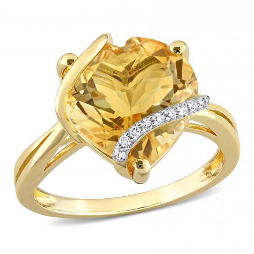 This heart-cut citrine swirl cocktail ring is crafted in yellow plated sterling silver. This beautiful crossover ring features a heart-cut, prong-set citrine as its centerpiece and 10 round-cut sparkling diamonds in a unique swirl split shank design. Enhanced with a high polished finish, this pretty gemstone and diamond ring is a valuable addition to any jewelry collection. Treat yourself or a friend to this beautiful cocktail ring.