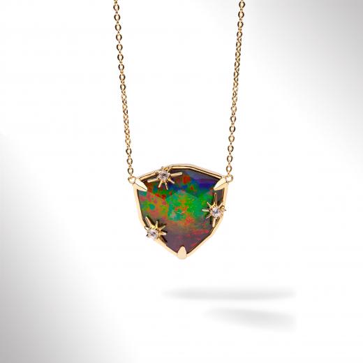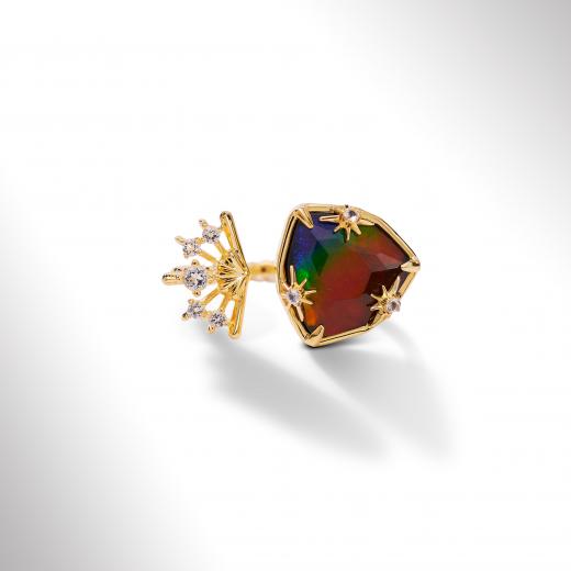 The Starlight collection features a twinkling fusion of trillion-cut Ammolite and 18K gold vermeil, inspired by the diffusing light of stars.