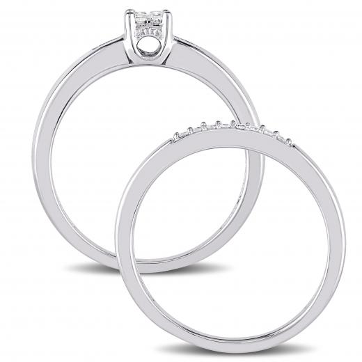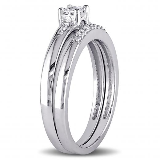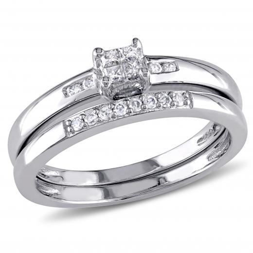 This exquisite diamond bridal set, will show her your everlasting love. Crafted in lustrous sterling silver, four sparkling princess-cut, invisible-set white diamonds at the center and four round-cut, channel-set diamonds shimmer along the sides. The companion wedding band is a perfect match with eight icy round-cut, prong-set white diamonds as well. These rings are enhanced with high polish finish.
