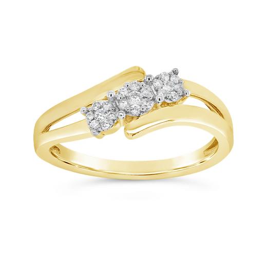 Shine brightly in this phenomenal 10K yellow gold fashion ring. With a unique off-centre design, this ring classically shows off three perfect round brilliant diamonds with a total weight of 0.15CTW. Perfect as a gift for that special someone, or as a treat to yourself, this ring is sure to become an instant favourite.