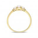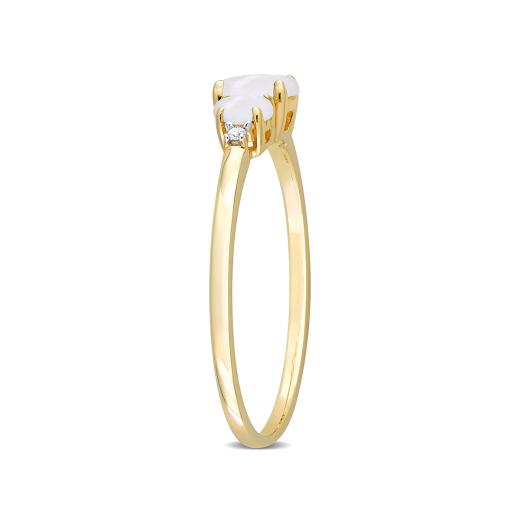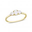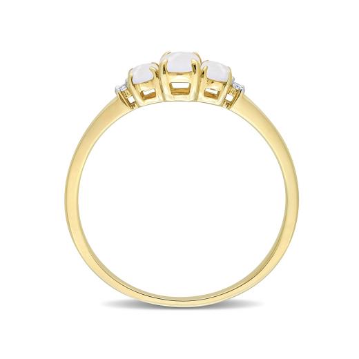 Look your absolute best with this simple yet elegant Opal and Diamond Accent Three-Stone Ring. Crafted in lustrous yellow gold, this classic ring features three oval-cut, prong set, opal gemstones studded at the center with two prong-set diamonds (G-H-I, I2-I3) embellished on either side of the stones. Polished with a brilliant shine, this ring is a perfect everyday accessory.