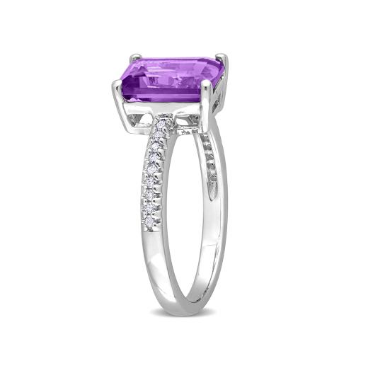 Add a splash of color to your ensemble with this vibrant pear sky blue topaz octagon amethyst and diamond two-stone ring. Crafted in lustrous sterling silver, this unique ring showcases one pear-cut prong-set sky blue topaz, one octagon-cut prong-set amethyst gemstone, and 18 round, buttercup-set diamonds studded along the edges of the sleek band. Enhanced with a polished finish, this stylish ring is a versatile fashion accessory.