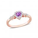 Get your glam on with this exceptional amethyst created white sapphire and diamond accent heart halo ring. Crafted in lustrous rose plated sterling silver, this classic ring features a heart-cut, prong set, amethyst decorated with a halo created by 12 prong-set created white sapphire gemstones and 4 pave-set diamonds embellished halfway on both sides of the band in heart designs. Finished with a brilliant polish, this promise ring is a perfect gift for your beloved partner.