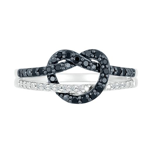 This elegant ring features a heart-shaped knot design adorned with black diamonds, totaling 0.18 carats. Crafted in sterling silver, it exudes a sense of elegance and sophistication with a touch of mystery from the black diamonds. The heart knot symbolizes a love that's intricately woven and bound together, making this ring a meaningful and stylish addition to your collection. It represents the depth and beauty of a heartfelt connection with a touch of allure from the black diamonds.