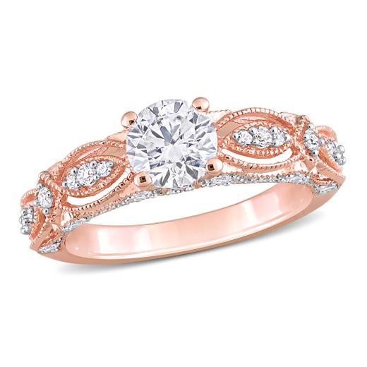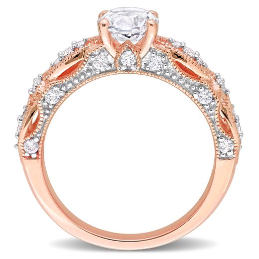 Seal your relationship with this charming ring. Mounted in glistening rose gold, this eye-catching ring showcases four round-cut, prong-set created white sapphire gemstones, 10 round-cut, prong-set diamonds and 14 round-cut, pave-set created white sapphire gemstones. Enhanced with a high polished finish and accentuated with milgrain design, this ravishing ring is perfect to commence lifelong ride of love and devotion.