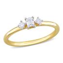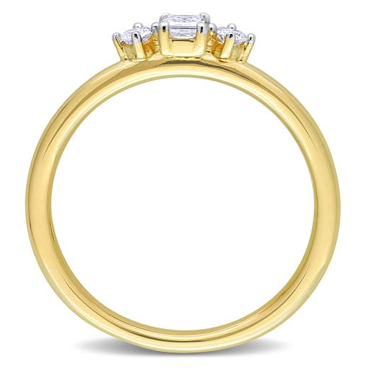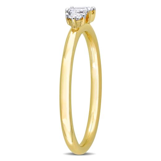 This ring is an ideal gift for women with a minimalist fashion sense. Crafted in luminous 14k yellow gold, this chic ring features one central emerald-cut diamond embellished with two round-cut prong-set diamonds (G-H, I1-I2) mounted on either side. Enhanced with a polished finish, this ring is perfect for everyday wear.