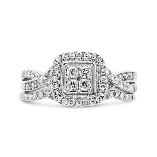 Celebrate the beauty of love with the 10K White Gold 0.50CTW Diamond Bridal Set featuring a square center cluster. The engagement ring is perfectly complemented by two matching wedding bands, completing the set in exquisite harmony. Crafted in luminous 10K white gold, this bridal set is a testament to the enduring nature of your commitment. The brilliant sparkle of the diamonds and the timeless design make this set a symbol of your unique and everlasting love story.