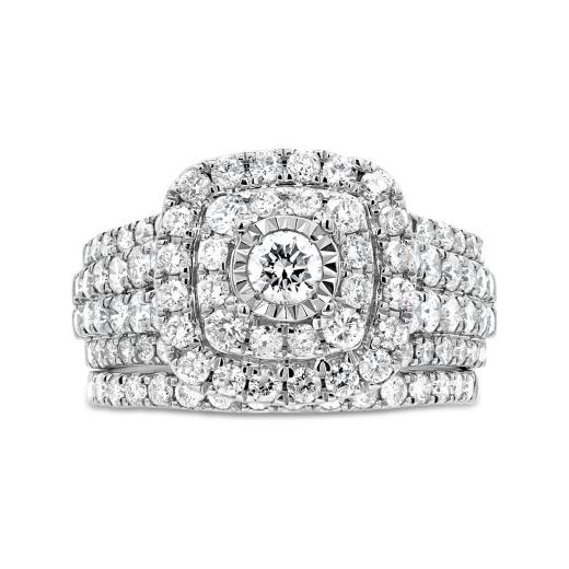 Celebrate the profound journey of love with the exquisite 10K White Gold 2.00CTW Diamond Bridal Set. This enchanting set is a testament to timeless elegance and enduring commitment. The engagement ring features a dazzling array of diamonds, with a brilliant centerpiece diamond. The surrounding diamonds, forming a halo, enhance the ring's allure. The coordinating wedding bands complement the engagement ring with their own shimmering diamonds, creating a harmonious and captivating ensemble. Crafted in lustrous 10K white gold, this bridal set symbolizes the purity and brilliance of your love story. Embark on the next chapter of your life's journey with this stunning and meaningful expression of love.