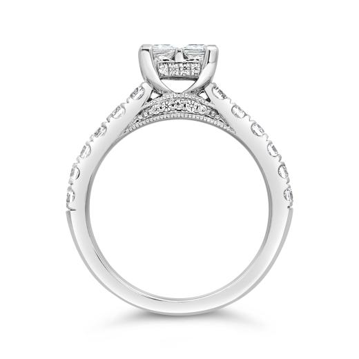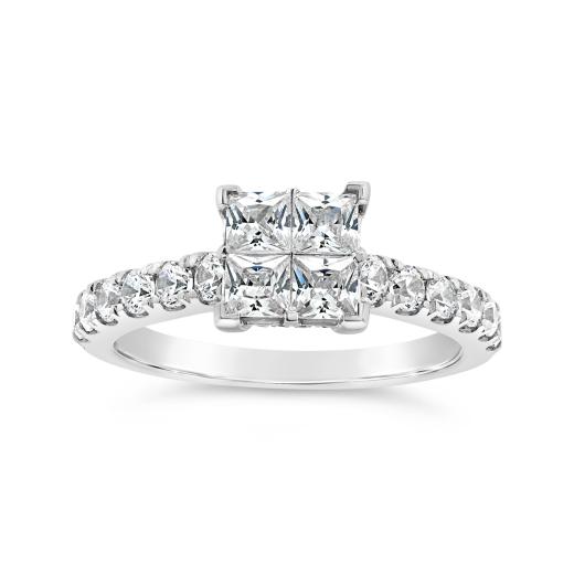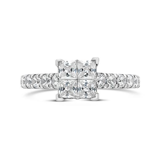 Elevate your love story with the timeless elegance of this 14K White Gold 1.52CTW Princessa Diamond Bridal Ring. The captivating design features a prominent arrangement of four princess shaped diamonds in the center, creating a stunning visual focal point. The surrounding hidden halo of smaller diamonds enhances the overall radiance and adds a touch of sophistication.  This bridal ring is a symbol of enduring love, blending classic charm with a modern aesthetic.