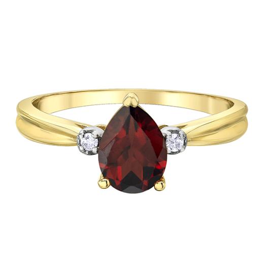 This gorgeous ring features a pear cut garnet accented by two shimmering diamonds. This ring is set in 10k gold and enhanced with a high polish finish. Garnet is the January birthstone, making this pendant the ideal choice as a birthday gift, or adding a touch of class to your own jewellery collection.