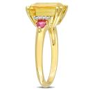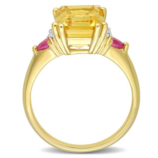 Get party-ready with this striking Citrine and Ruby Diamond Accent Cocktail Ring. Crafted in lustrous 18-karat Yellow Gold Plated Sterling Silver, this bold ring features one octagon-cut, prong-set citrine (10x8mm) bordered by two trilliant-cut, prong-set ruby (3x3mm) gemstones decorated with eight round-cut, prong-set diamonds (G-H, I2-I3). Enhanced with a polished finish, this splendid ring is sure to stand out. This ring is an instant solution to fix your glam needs.