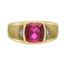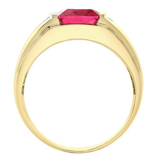 Bold and distinguished, this 10K yellow gold men's ring showcases a vibrant created ruby, complemented by dazzling diamond accents. The striking contrast between the fiery red gemstone and the warm gold setting makes it a powerful statement piece for the modern man.