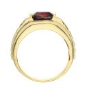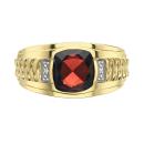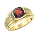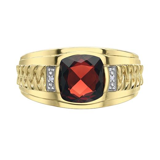 Sophisticated and striking, this 10K yellow gold men's ring features a rich, deep red garnet at its center, accentuated by sparkling diamond details. The bold design and timeless elegance make it the perfect statement piece for the modern gentleman.