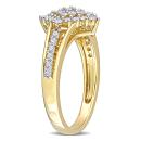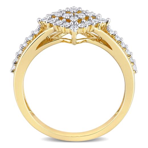 This diamond cluster split shank engagement ring is crafted in 14-karat yellow gold. This wedding ring features 37 round-cut, prong-set shimmering diamonds in a unique clustered geometric split shank bridal ring design. Enhanced with high polish finish, this modern diamond ring will make a standout addition to any jewelry collection.
