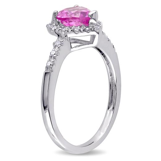 Make her heart flutter with this Created Pink Sapphire and Diamond Heart Halo Ring. Crafted in radiant sterling silver and features a heart-cut, prong-set created pink sapphire at the center with a halo of 20 round-cut, buttercup-set diamonds (G-H, I2-I3) augmented in a heart design and also studded half way on its band. Enhanced with a high polish finish, this halo heart ring is the perfect addition to any jewelry collection. Make her feel like a princess with this heart halo ring.
