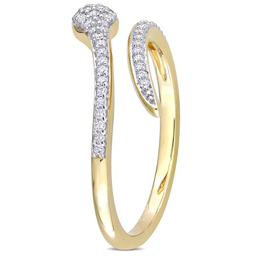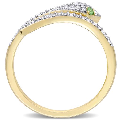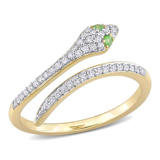 This captivating 1/5 CT TW Diamond with Tsavorite Accent Snake Ring in 10k Yellow Gold, a symbol of mystique and elegance. Crafted with intricate detail, this ring features a mesmerizing snake design adorned with sparkling diamonds totaling 1/5 carat in weight. Accentuated with vibrant tsavorite gemstones, the snake's eyes glimmer with natural allure against the rich backdrop of 10k yellow gold. Whether worn as a statement piece or a unique addition to your collection, this ring exudes timeless charm and sophistication. Embrace the allure of ancient symbolism and modern luxury with this stunning snake ring, destined to captivate admirers wherever you go.