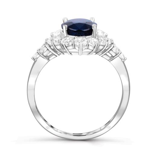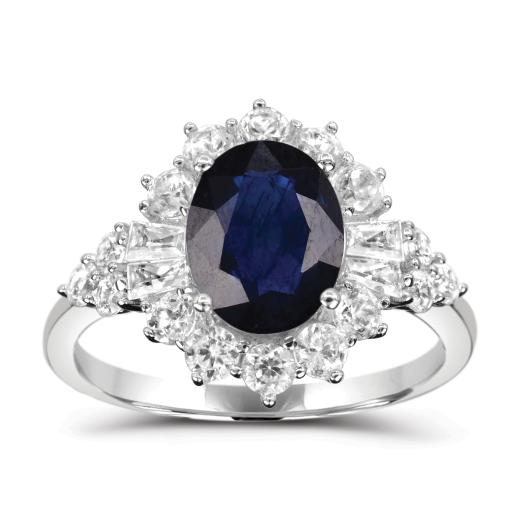 This stunning ring showcases a vibrant blue sapphire at its center, surrounded by a halo of sparkling white zircon stones. Set in polished sterling silver, the combination of the rich blue hue and the brilliance of the white zircons creates a striking contrast that captures attention. The intricate halo design enhances the sapphire’s natural beauty, while the sleek band adds a touch of elegance.