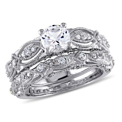 Embrace timeless elegance with this 1/10 CT TW Diamond and Created White Sapphire Vintage Filigree Bridal Set. Crafted in 10k white gold, this set features a stunning combination of diamonds and created white sapphires, accentuated by intricate filigree details. The vintage-inspired design offers a classic and romantic charm, making it the perfect choice for your special day. This bridal set is a beautiful symbol of your everlasting love.