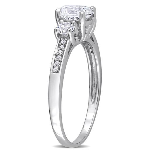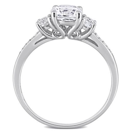 Sign up for a life filled with every emotion when you slide this classy 3-Stone Engagement Ring on her finger. Crafted in sparkling white gold, this elegant ring showcases one (6x6mm), two (3x3mm) round-cut, prong-set created white sapphire gemstones and 12 round-cut, pave-set diamonds (G-H, I2-I3). Polished to brilliance, this flawless ring is perfect to mark the beginning of something new and exciting.